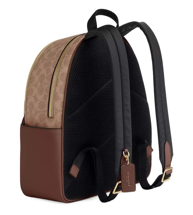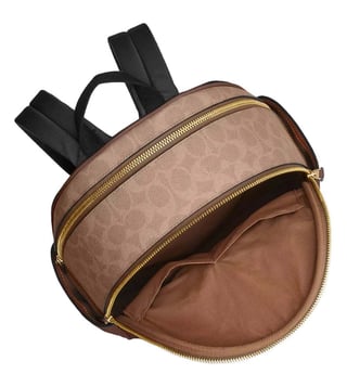 Coach Light Brown Court Medium Backpack crafted in coated canvas and leather featuring zip closure, 2 compartments, inside zip slip pockets, outside zip pocket, front logo, top handle with adjustable backpack straps. Products purchased from Darveys are supported exclusively by the warranty/exchange policies of Darveys and its partner boutiques. Brand owners and their channel partners are not responsible for exchange/warranty services for items purchased through Darveys.