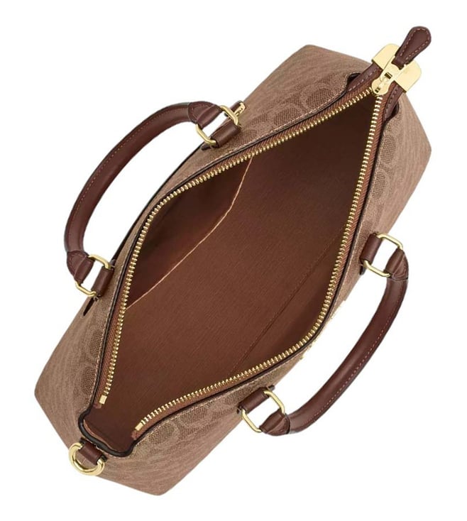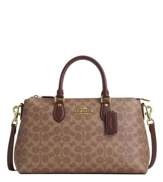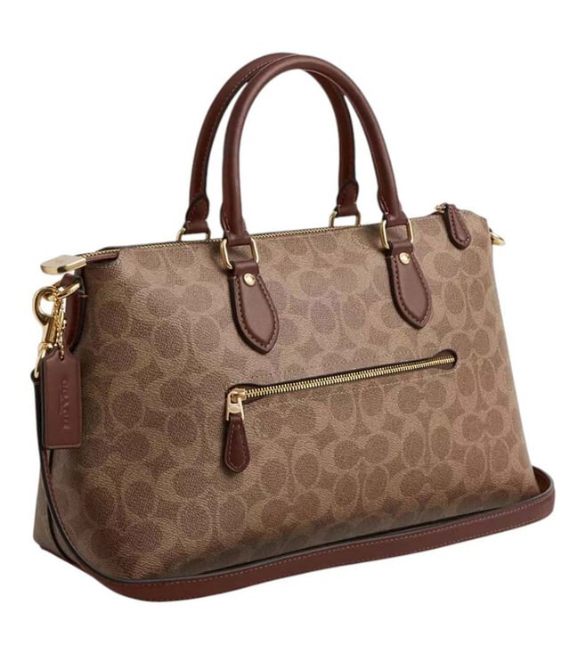 Coach brown georgia large satchel crafted in coated canvas featuring zip closure, 1 compartment, inside slip pocket, outside zip pocket, front logo, dual carry handles with removable and adjustable shoulder strap.