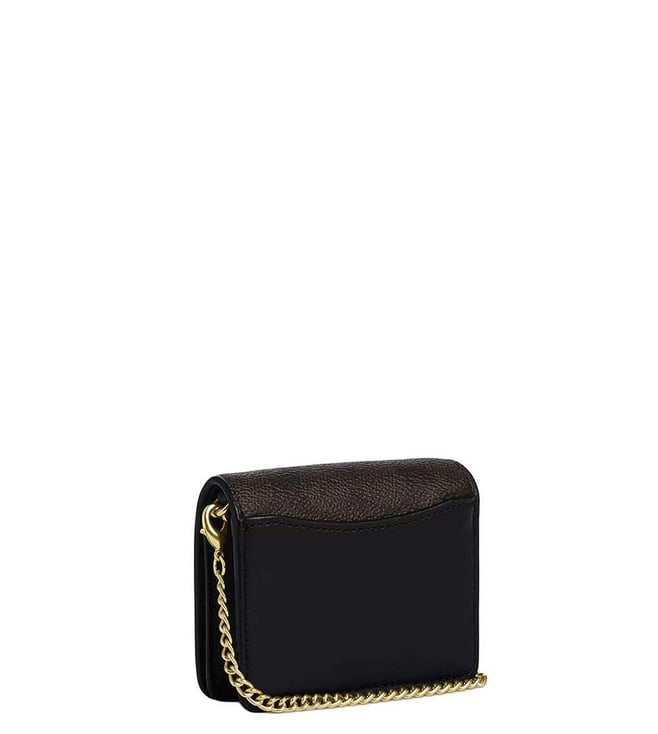 Coach Dark Brown Signature Mini Crossbody Bag crafted in coated canvas and leather featuring snap closure, 1 compartment, two credit card slots, outside open pocket, logo detailing, detachable chain strap. Products purchased from Darveys are supported exclusively by the warranty/exchange policies of Darveys and its partner boutiques. Brand owners and their channel partners are not responsible for exchange/warranty services for items purchased through Darveys.