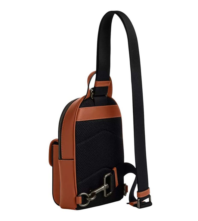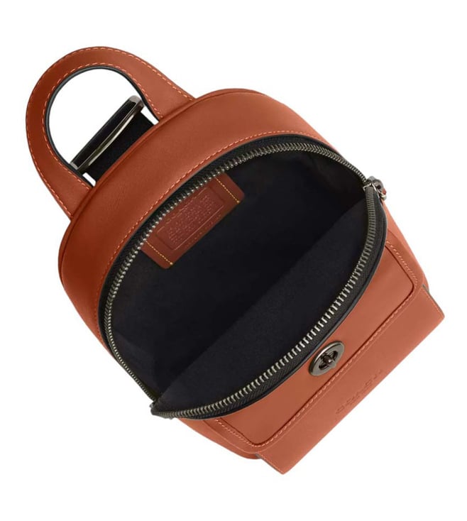 Coach brown turnlock sling small crossbody bag crafted in leather featuring zip closure, 1 compartment, outside turnlock pocket, font logo, top handle with adjustable crossbody strap.