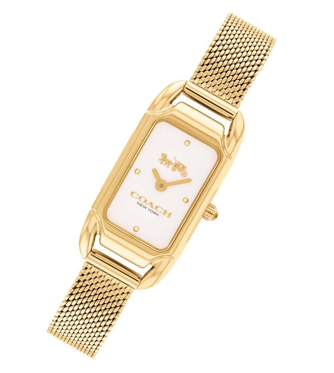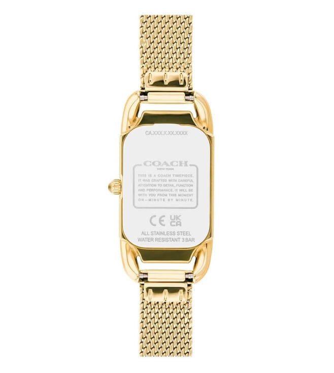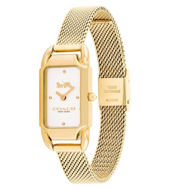 Complement your personality with this watch from the Cadie collection by Coach. Enclosed in a 17.5 mm case, the rectangle-shaped dial is secured by mineral glass. It displays plain 2-hand functionality and works on a quartz movement. It is water resistant up to 30 m. Besides, it is finished with a fold-over clasp that provides a secure fit on the wrist.