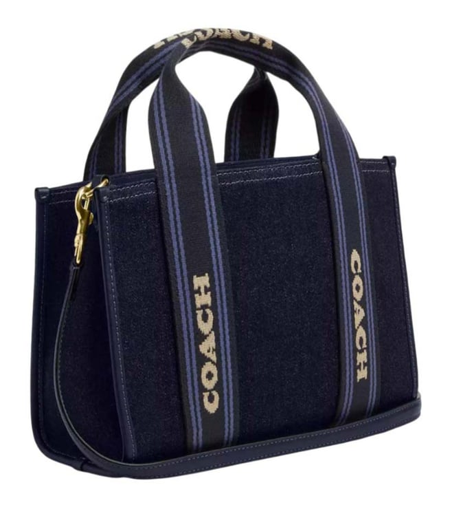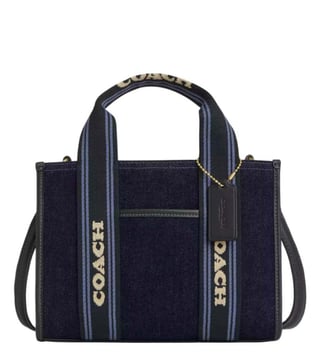 Coach dark blue smith 24 small tote crafted in denim and leather featuring snap closure, 1 compartment, inside pockets, outside open pocket, logo detailing, dual carry handles with removable shoulder strap. Products purchased from darveys are supported exclusively by the warranty/exchange policies of darveys and its partner boutiques. Brand owners and their channel partners are not responsible for exchange/warranty services for items purchased through darveys.