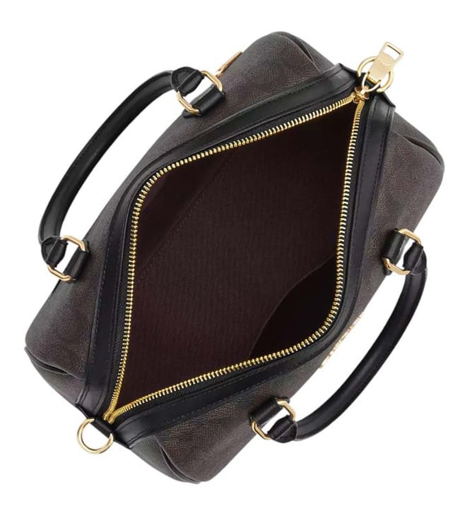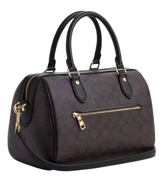 Coach dark brown rowan small satchel crafted in coated canvas and leather featuring zip closure, 1 compartment, inside zip and slip pockets, outside zip pocket, logo detailing, dual carry handles with removable shoulder strap.