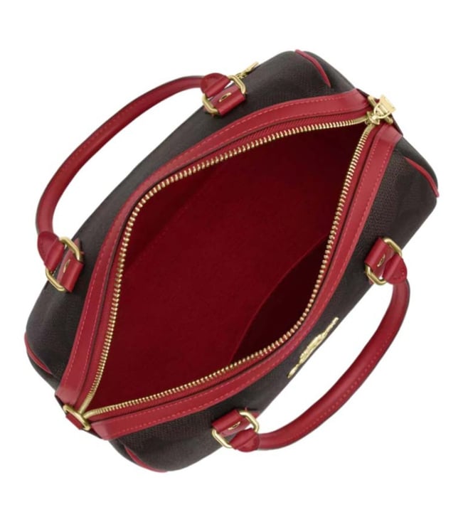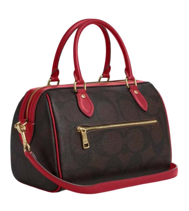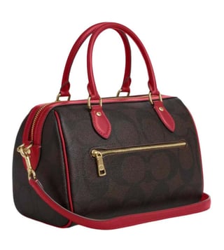 Coach dark brown rowan small satchel crafted in coated canvas and leather featuring zip closure, 1 compartment, inside zip and slip pockets, outside zip pocket, logo detailing, dual carry handles with removable shoulder strap. Products purchased from darveys are supported exclusively by the warranty/exchange policies of darveys and its partner boutiques. Brand owners and their channel partners are not responsible for exchange/warranty services for items purchased through darveys.