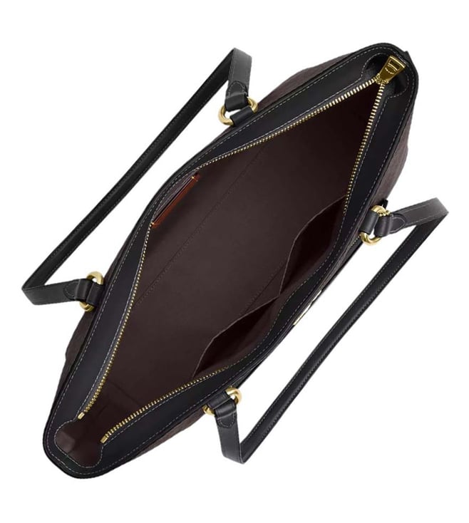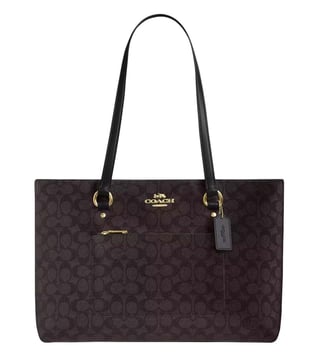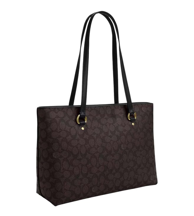 Coach dark brown station large tote crafted in signature coated canvas and leather featuring zip closure, 1 compartment, inside zip and multifunction pockets, outside zip pocket, metal logo, dual carry handles.