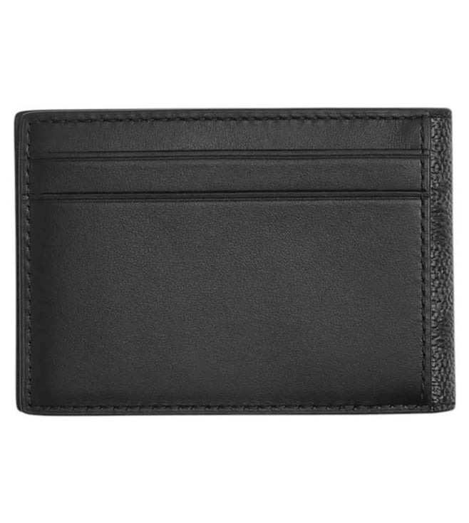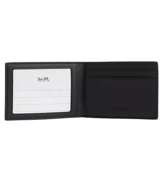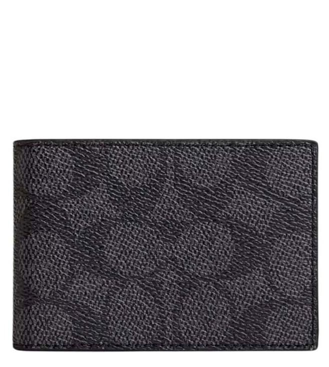 Accessorize perfectly with this dark grey signature bi-fold card holder by Coach crafted in coated canvas and leather featuring an outside open pocket, an inside open pocket, two inside credit card slots, two outside credit card slots, an ID window and logo detailing. Dimension: 10.16 x 6.9 cm.