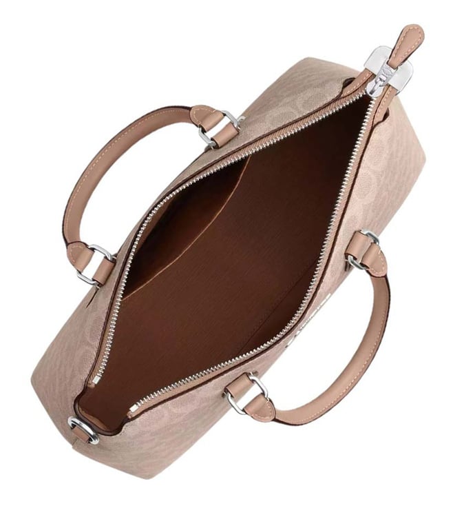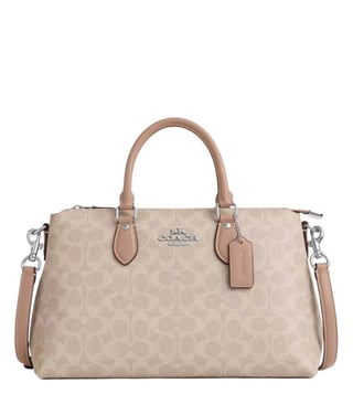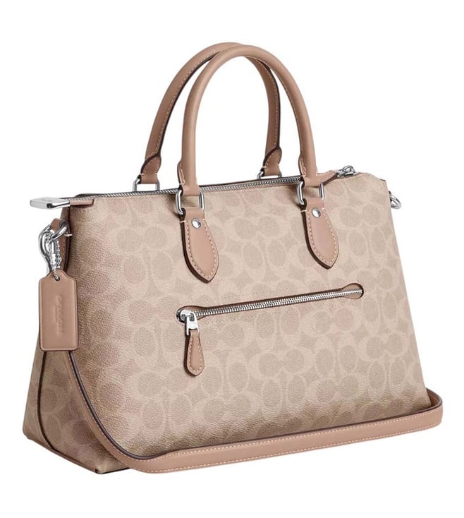 Coach khaki georgia large satchel crafted in coated canvas featuring zip closure, 1 compartment, inside slip pocket, outside zip pocket, front logo, dual carry handles with removable and adjustable shoulder strap.