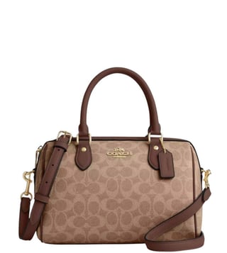 Coach khaki rowan small satchel crafted in coated canvas and leather featuring zip closure, 1 compartment, inside zip and slip pockets, outside zip pocket, logo detailing, dual carry handles with removable shoulder strap. Products purchased from Darveys are supported exclusively by the warranty/exchange policies of Darveys and its partner boutiques. Brand owners and their channel partners are not responsible for exchange/warranty services for items purchased through Darveys.