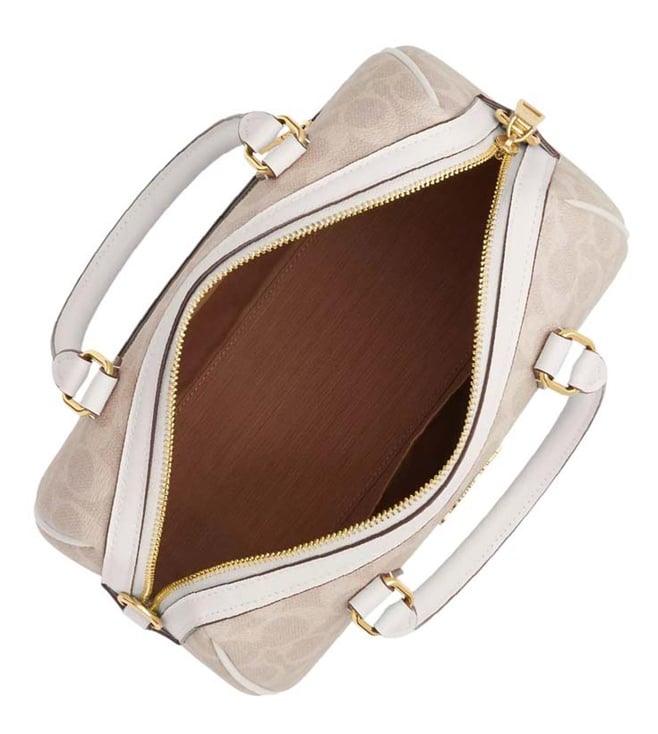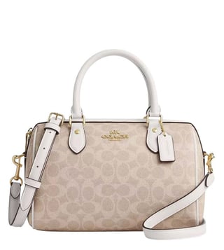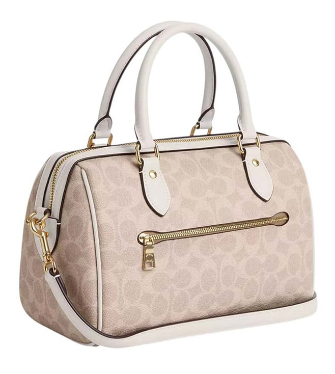 Coach khaki rowan small satchel crafted in coated canvas and leather featuring zip closure, 1 compartment, inside zip and slip pockets, outside zip pocket, logo detailing, dual carry handles with removable shoulder strap.