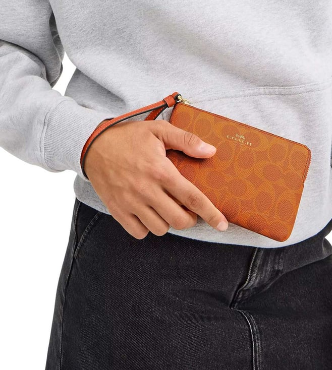 Accessorize perfectly with this orange signature corner zip wristlet by Coach crafted in coated canvas featuring zip closure, 2 credit card slots, wrist strap and logo detailing. Dimensions: 15.87 x 10.16 x 1.27 cm. Products purchased from Darveys are supported exclusively by the warranty/exchange policies of Darveys and its partner boutiques. Brand owners and their channel partners are not responsible for exchange/warranty services for items purchased through Darveys.