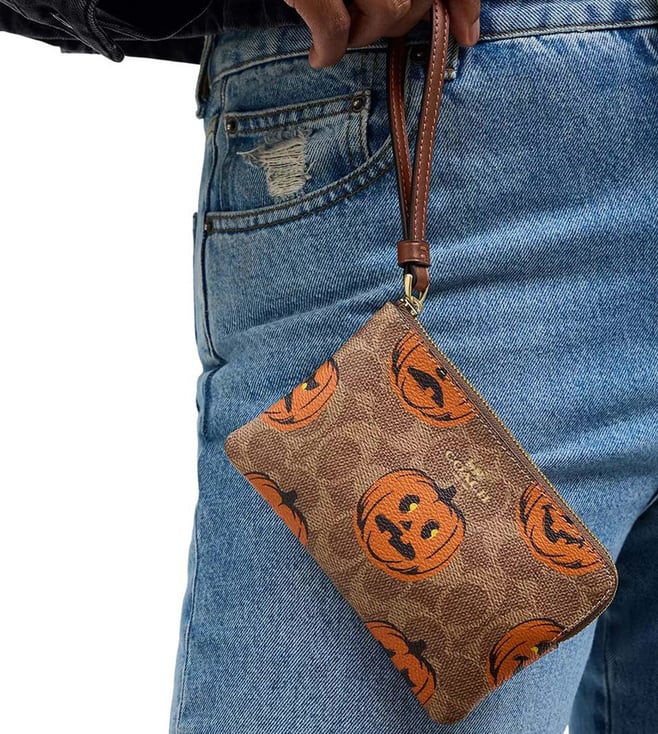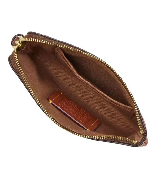Accessorize perfectly with this tan printed corner zip wristlet by Coach crafted in coated canvas featuring zip closure, 2 credit card slots, wrist strap and logo detailing. Dimensions: 15.87 x 10.16 x 1.27 cm. Products purchased from Darveys are supported exclusively by the warranty/exchange policies of Darveys and its partner boutiques. Brand owners and their channel partners are not responsible for exchange/warranty services for items purchased through Darveys.