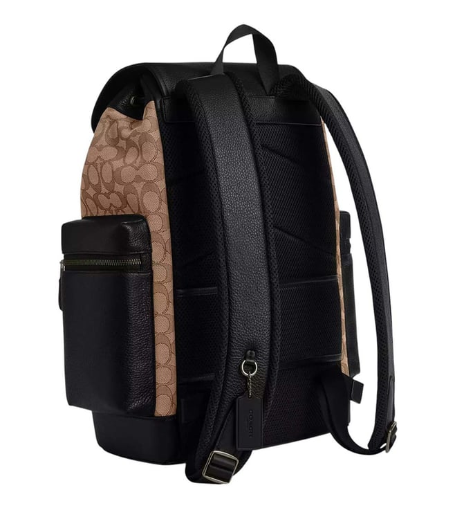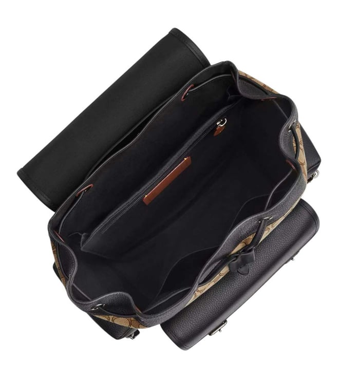 Coach tan sprint large backpack crafted in jacquard and leather featuring drawstring and snap closures, 1 compartment, inside zip and multifunction pockets, outside zip and flap pockets, logo detailing, top handle with adjustable backpack straps.