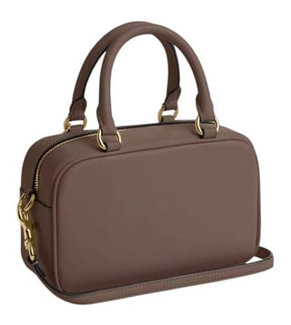 Coach taupe logo mini satchel crafted in leather featuring zip closure, 1 compartment, inside card slots, metal logo, dual carry handles with removable crossbody strap.