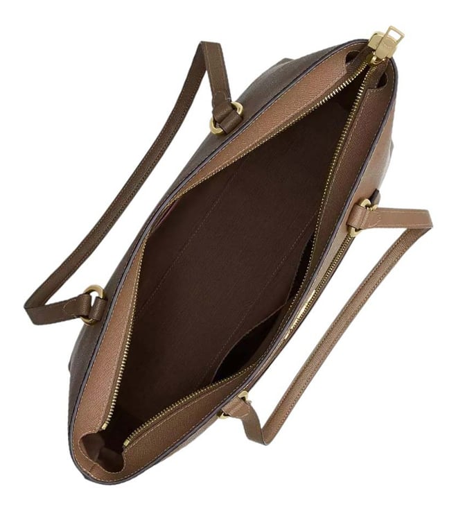 Coach taupe station large tote crafted in leather and coated canvas featuring zip closure, 1 compartment, inside zip and multifunction pockets, outside zip pocket, metal logo, dual carry handles.