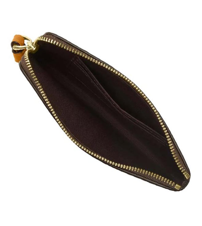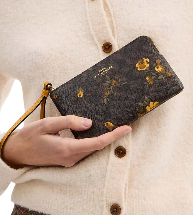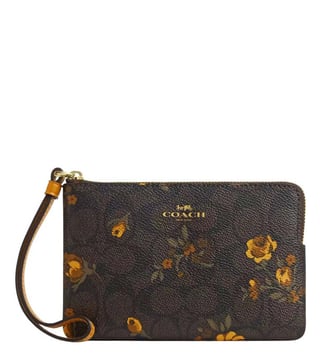 Accessorize perfectly with this walnut brown signature floral print wristlet by Coach crafted in coated canvas featuring zip closure, 2 credit card slots, wrist strap and logo detailing. Dimensions: 15.87 x 10.16 x 1.27 cm. Products purchased from Darveys are supported exclusively by the warranty/exchange policies of Darveys and its partner boutiques. Brand owners and their channel partners are not responsible for exchange/warranty services for items purchased through Darveys.