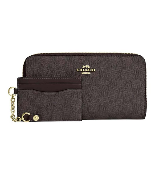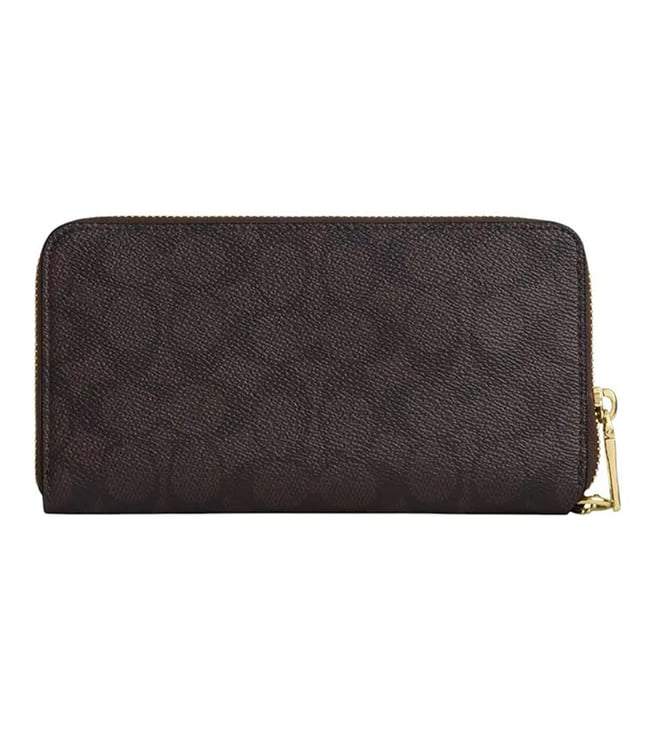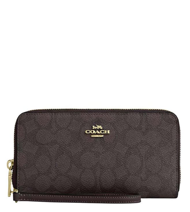 Accessorize perfectly with this walnut signature zip around wallet by Coach crafted in coated canvas featuring zip around closure, 12 credit card slots, zip coin pocket, detachable wrist strap, bill compartment, detachable card case with 2 credit card slots, id window, attached chain strap with snap button and logo detailing to give you a luxe appeal.
