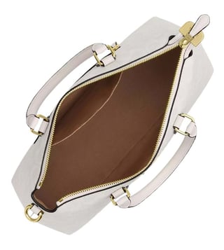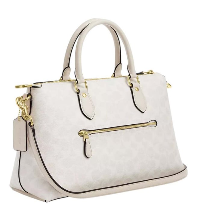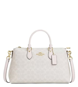 Coach white georgia large satchel crafted in coated canvas featuring zip closure, 1 compartment, inside slip pocket, outside zip pocket, front logo, dual carry handles with removable and adjustable shoulder strap.