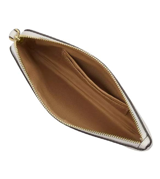 Accessorize perfectly with this white graphic print corner zip wristlet by Coach crafted in leather featuring zip closure, 2 credit card slots, wrist strap and logo detailing. Dimensions: 19.68 x 12.06 x 1.27 cm. Products purchased from Darveys are supported exclusively by the warranty/exchange policies of Darveys and its partner boutiques. Brand owners and their channel partners are not responsible for exchange/warranty services for items purchased through Darveys.