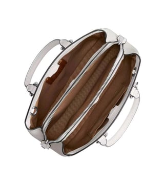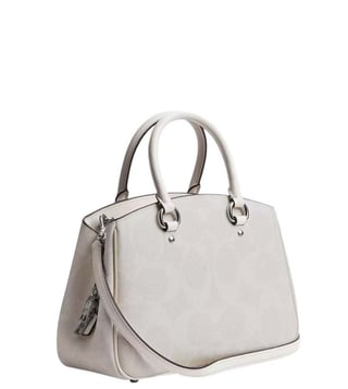 Coach white savannah carryall small satchel crafted in coated canvas and leather featuring magnetic snap closure, 2 compartments, center zip compartment, inside slip pockets, front logo, dual carry handles with removable shoulder strap. Products purchased from Darveys are supported exclusively by the warranty/exchange policies of Darveys and its partner boutiques. Brand owners and their channel partners are not responsible for exchange/warranty services for items purchased through Darveys.