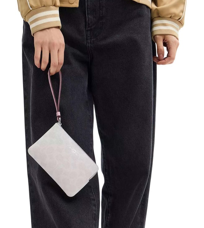 Accessorize perfectly with this white signature corner zip wristlet by Coach crafted in coated canvas featuring zip closure, 2 credit card slots, wrist strap and logo detailing. Dimensions: 15.87 x 10.16 x 1.27 cm. Products purchased from Darveys are supported exclusively by the warranty/exchange policies of Darveys and its partner boutiques. Brand owners and their channel partners are not responsible for exchange/warranty services for items purchased through Darveys.