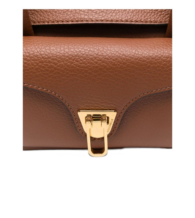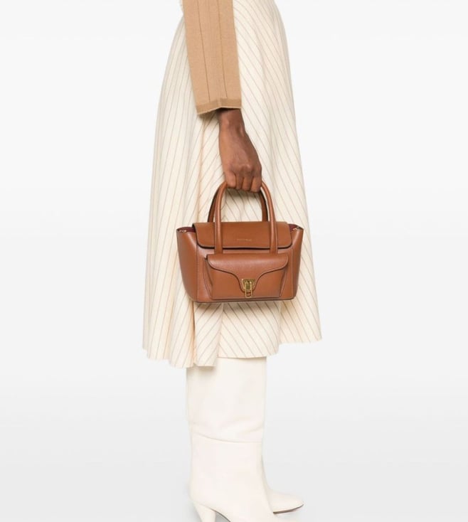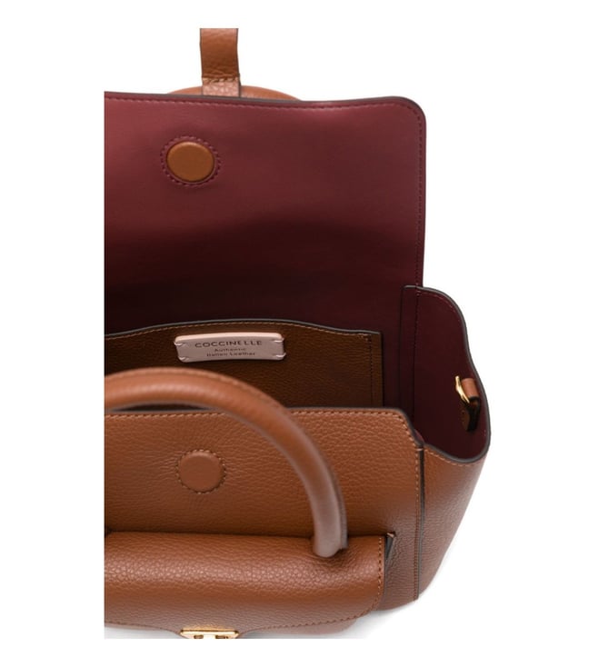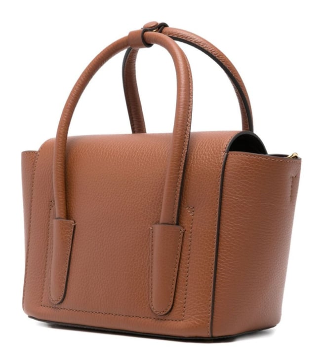 Brown Beat Satchel, magnetic closure, 1 compartment, 1 slip pocket, one plug closure pocket on the front side, textured, front logo, dual carry handles with removable and adjustable shoulder strap. With its timeless design and practical features, this bag is a must-have accessory for the modern woman on-the-go.