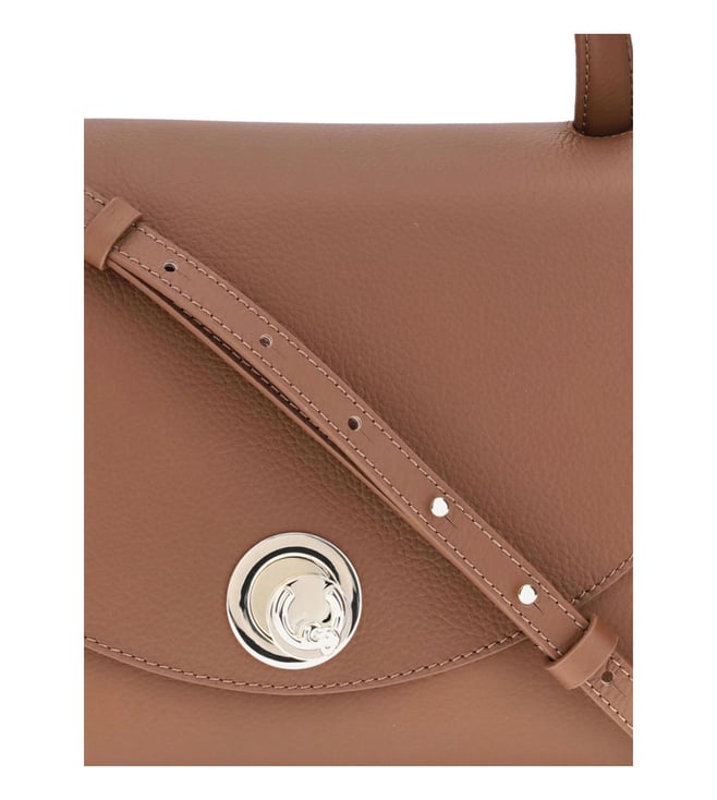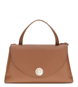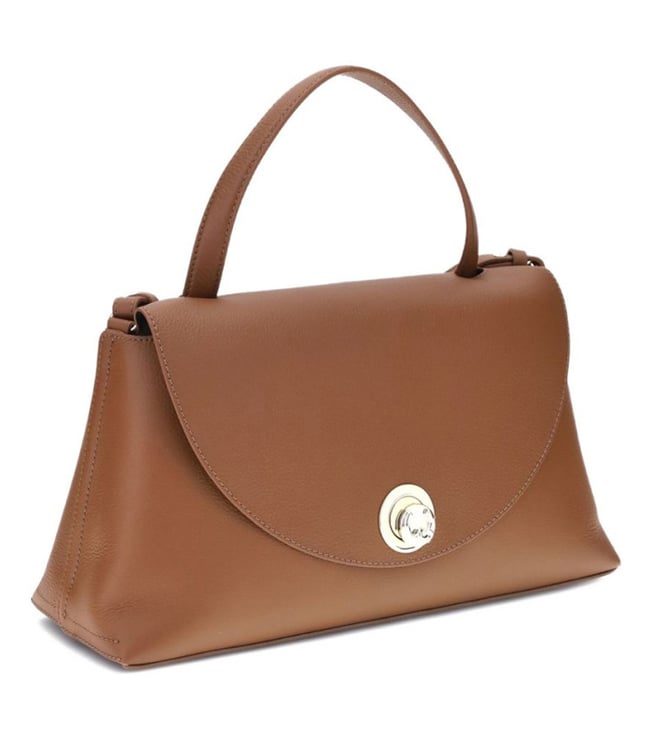 Brown Nikla Handbag, Turn lock closure with C-Me logo, 2 compartments, inside pocket, inside logo, top handle with removable adjustable crossbody strap. With its timeless design and practical features, this bag is a must-have accessory for the modern woman on-the-go.