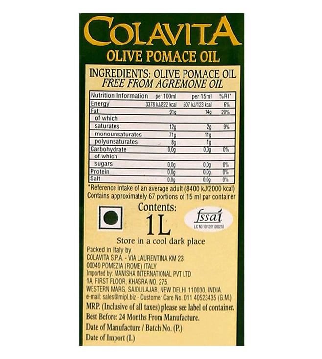 COLAVITA Pomace Olive Oil is the residue oil that is extracted from good quality Italian olives. This oil is highly refined to remove chemical impurities. Enriched with virgin olive oil, this grade of olive oil does not have any taste, aroma or colour. Ideal for those who prefer a lighter taste than extra virgin olive oil and for maintaining the real taste of food cooked in this oil. Sauté,, fry, or bake with this versatile oil. Use as a replacement for butter to create exceptionally moist baked goods.