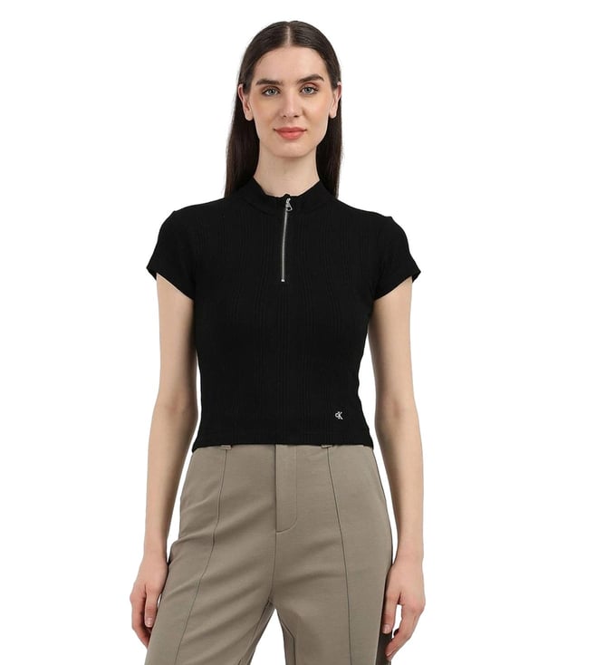 Black Slim Fit Cotton Half-Zip Neck Top