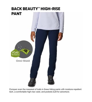 Omni-Shield Release resists fluids and stains using quick-drying, stain-releasing yarns, so you stay clean and dry in wet, messy situations, Partial elastic waist for a secure fit, Gaiter clips on cuffs help block debris, Gusset detail for comfort as you move, Utility loop in back for a carabiner clip, Drop-in pocket and zippered pocket on right leg for small items, High rise for a comfortable fit and coverage, Uses Hiking, Imported.