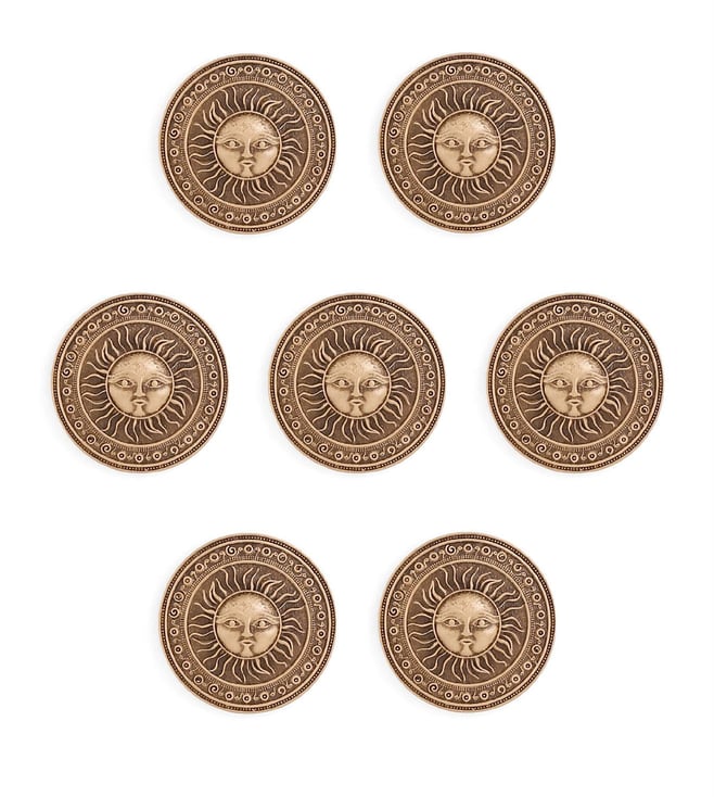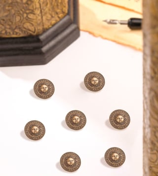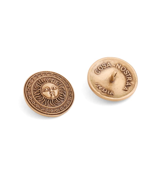 This Cosa Nostra Antique Gold Luminous Sun Button is perfect for festive occasions. Its antique gold color adds a touch of elegance to any outfit, designed for men to stand out from the crowd. Add a shimmering touch to your outfit and make a statement with this button.' Disclaimer: All other items in the image are only for display purposes and will not be a part of the delivery content. Product colour may slightly vary due to photographic lighting sources. Country of Origin - India.