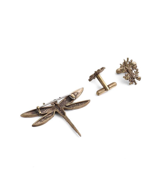 This exquisitely crafted gift set from Cosa Nostraa includes a dragonfly brooch and medieval cufflinks in antique gold. They are made of brass metal for durability. These accessories are surely going to liven up your outfit. Disclaimer: Product colour may slightly vary due to photographic lighting sources. Country Of Origin - India.