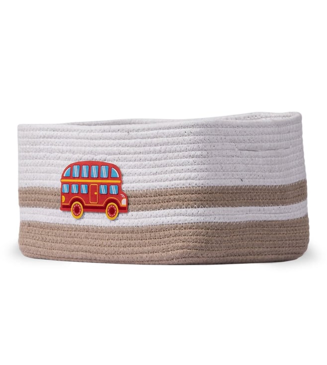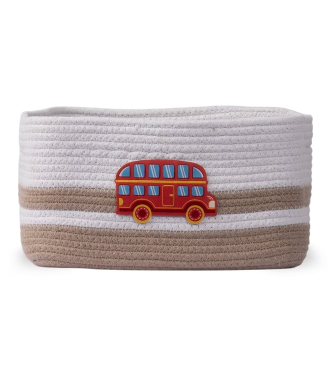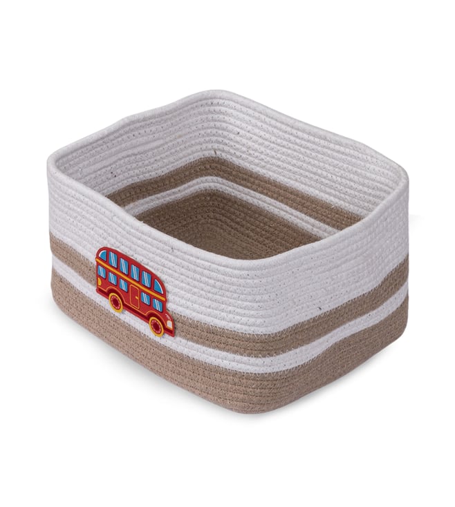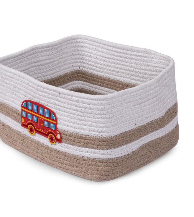 Bring joy and imagination to your little one's space with this charming Toy Storage Basket, featuring beige stripes and a playful car motif from our Transport Trail collection. Expertly handcrafted from high-quality cotton rope, this small-sized rectangular basket is soft, sturdy and generously spacious¿perfect for keeping toys, books, and everyday nursery essentials neatly organised. Its lightweight construction and built-in handles make it easy to carry, and it folds away effortlessly when not in use. Ideal for playrooms, bedrooms and nurseries.