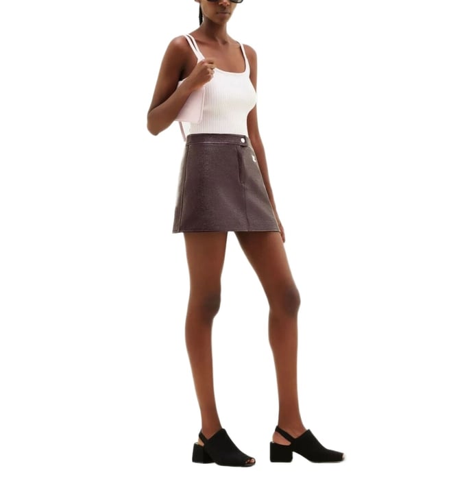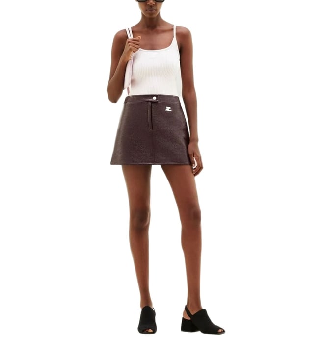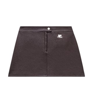 Elevate your wardrobe with the Courreges Brown skirt. Designed with iconic lined vinyl mini skirt with white ac logo on the front. white lacquered belt snaps and zipper fly. these trousers combine comfort and sophistication for everyday wear. Products purchased from Darveys are supported exclusively by the warranty/exchange policies of Darveys and its partner boutiques. Brand owners and their channel partners are not responsible for exchange/warranty services for items purchased through Darveys.