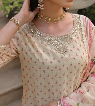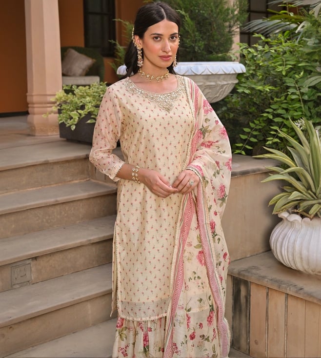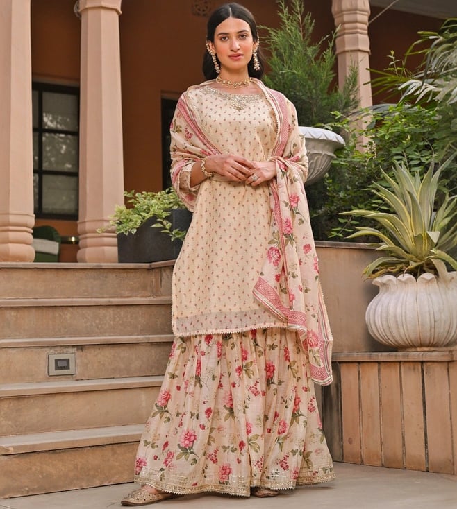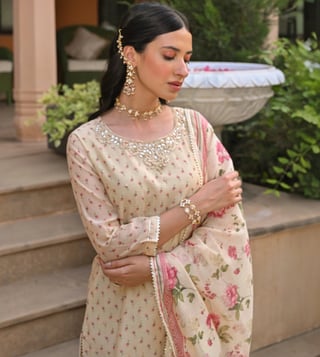 Mahee JaipurCream Ikhtiyar Small Buti Kurta with Sharara and Floral Dupatta