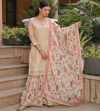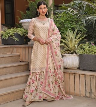 Style meets comfort in this sharara set. Crafted from soft, breathable chanderi, this piece ensures lasting comfort and effortless style. Team it with your choice of footwear and accessories. Disclaimer: Product colour may slightly vary due to photographic lighting sources. Country of Origin - India.