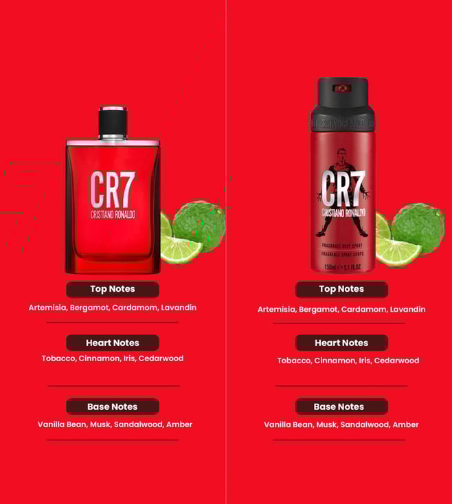 The scent of energy and sexiness for men who take up the challenge. Be the center of attention with the Cristiano Ronaldo CR7 Fragrance Body Spray. It's a body spray infused with bergamot, cedarwood and musk for an enticing fragrance. This Cristiano Ronaldo CR7 Eau de Toilette has a fruity, woody and citric scent for a delightful experience. This men's deodorant helps to keep your body odor-free throughout the day. This combo contains Cristiano Ronaldo CR7 Eau de Toilette - 50 ml, Cristiano Ronaldo CR7 Fragrance Body Spray - 150 ml.