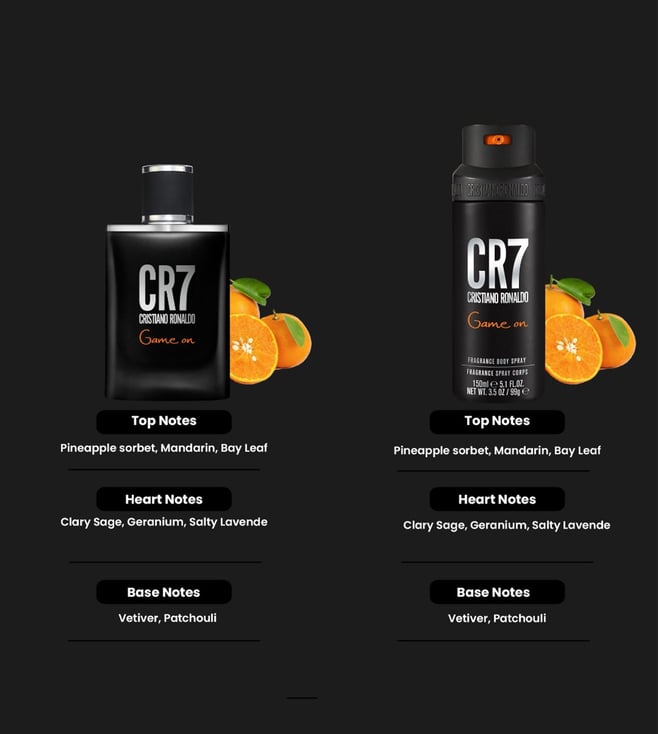 A total new look and lifestyle fragrance for the modern young man 16+. Casual and evening positioning, enhance your personality with the Cristiano Ronaldo CR7 Game On Fragrance Body Spray. It's a body spray infused with cardamom, cedarwood and juniper berry for an enticing fragrance. This Cristiano Ronaldo CR7 Game On Fragrance Body Spray has a floral scent for a delightful experience. This men's deodorant helps to keep your body odor-free throughout the day. This combo contains Cristiano Ronaldo CR7 Game On Eau de Toilette - 50 ml, Cristiano Ronaldo CR7 Game On Fragrance Body Spray - 150 ml.