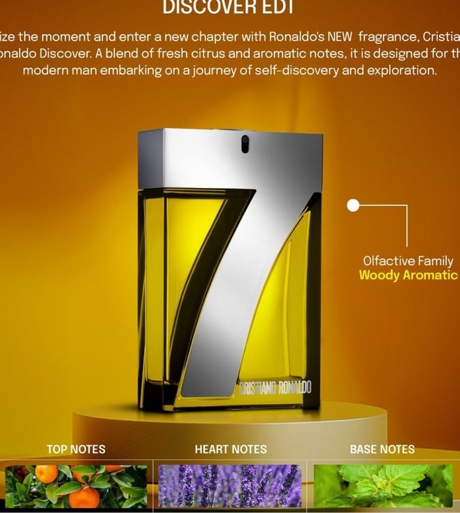 Seize the moment and enter a new chapter with Ronaldo's NEW fragrance, Cristiano Ronaldo Discover. A blend of fresh citrus and aromatic notes, it is designed for the modern man embarking on a journey of self-discovery and exploration. The fragrance opens with a lively trio of citrus ¿ Orange, Lemon, and Mandarin giving a boost of energy. The aromatic freshness of Sage and Lavandin unfolds, while the sensuality of Labdanum and the woody notes of Vetiver bring strength and confidence, for a long-lasting and intense scent.