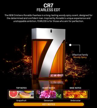 The NEW Cristiano Ronaldo Fearless is a long-lasting woody spicy scent, designed for the determined and confident man. Inspired by Ronaldo¿s unique experience and unstoppable ambition, FEARLESS is for those who aim for perfection.