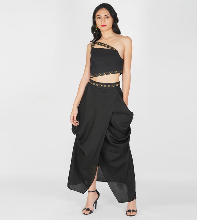 Yellow Eraya Emblished Drape Skirt With Cape And Crop Top