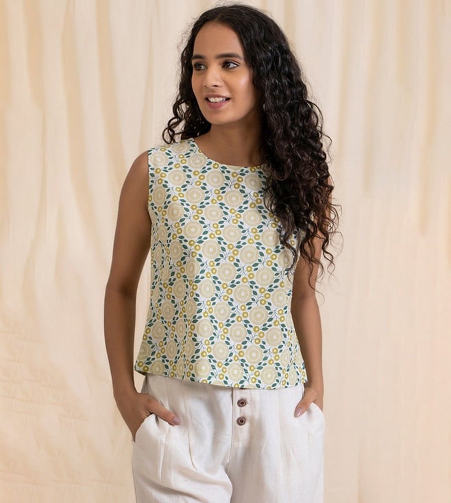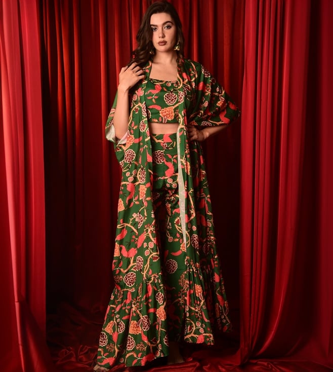 Green Printed Crop Top and Palazzo With Cape