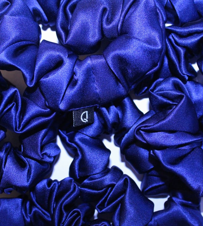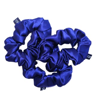 Pure silk doesn't tug or pull your hair thus reducing damage and breakage as opposed to traditional hair bands. These scrunchies have a wide surface area which prevent hairband dents and ridges. Now tie your hair all day and let them down at night without the need to style them. Because, bye bye hair dents! 22 momme grade 6A long thread 1 percent pure mulberry silk scrunchie. This pack contains 3 X DAME ESSENTIALS Medium Midnight Blue Pure Silk Scrunchies.