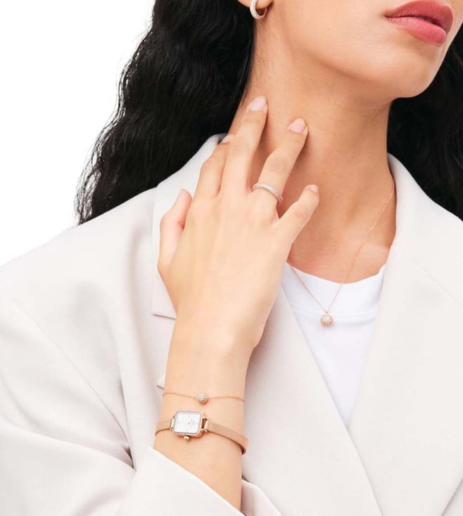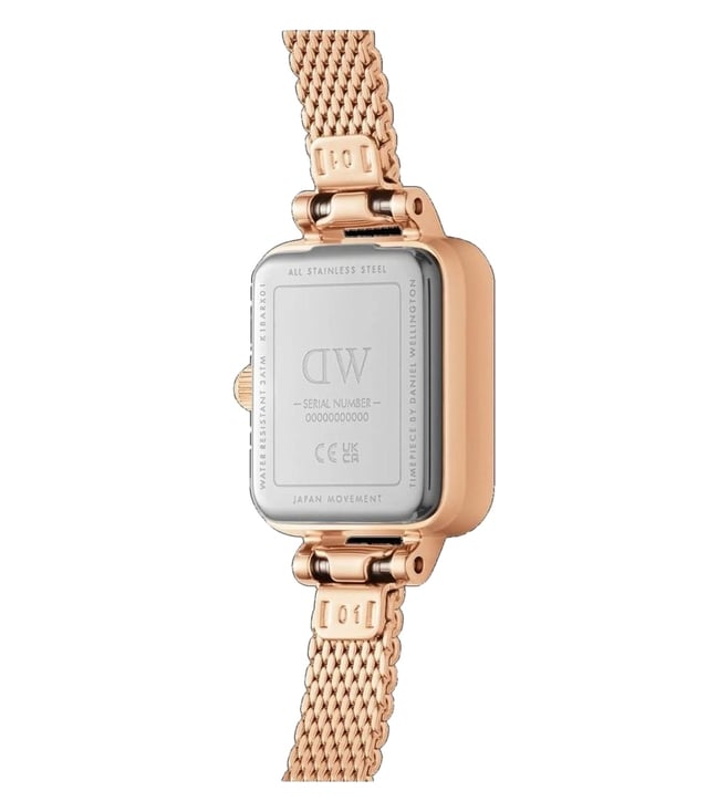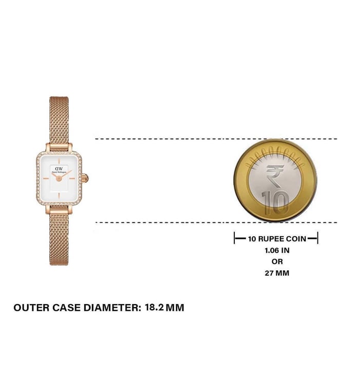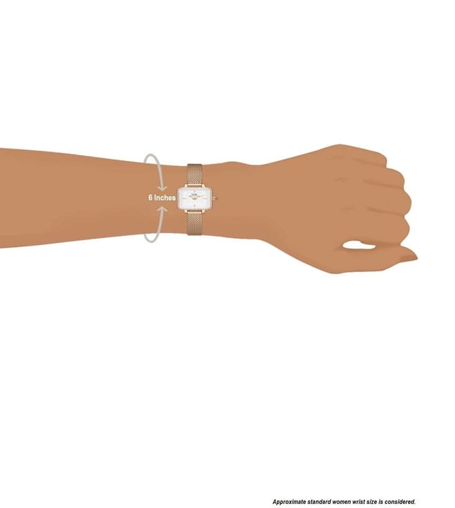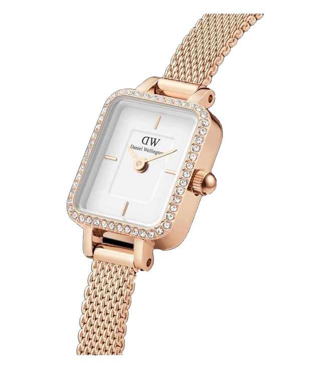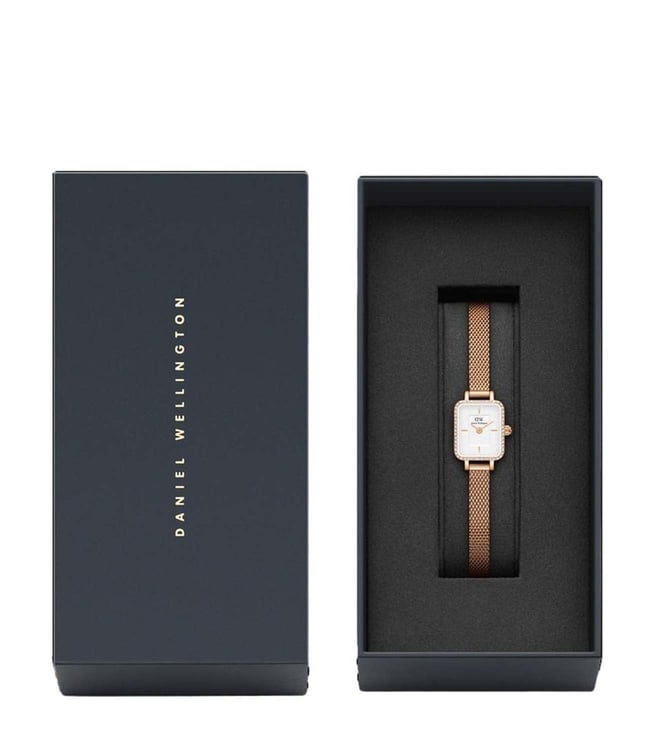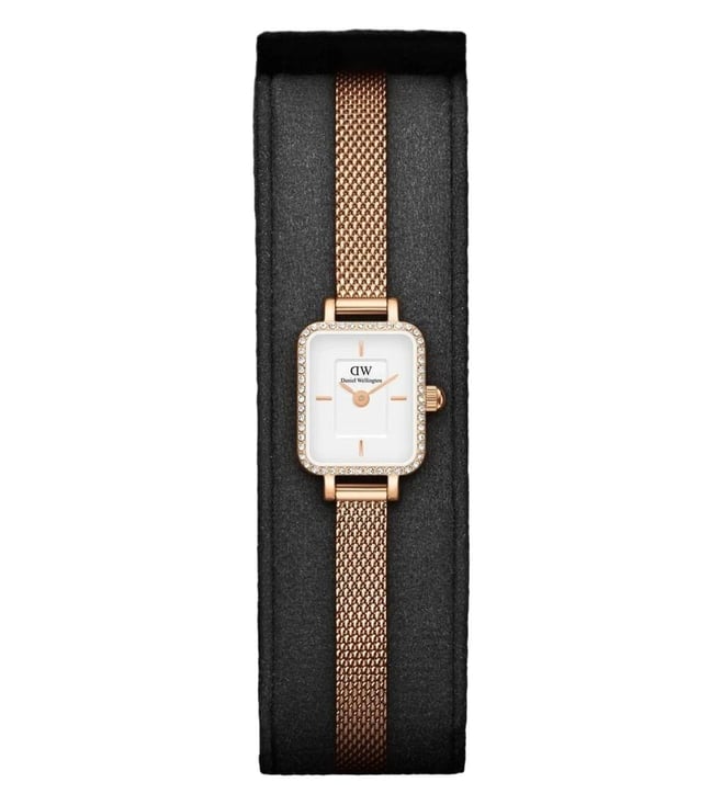 Splash your life with a tinge of liveliness and colour by wearing this women's analog watch from Daniel Wellington. The stainless steel strap flaunts a rose gold hue that elevates the look of the watch. Enclosed in a 18.2 mm case, the white square dial is secured by a mineral glass. It displays plain two hands. Besides, it is finished with a clasp that provides a secure fit on the wrist.