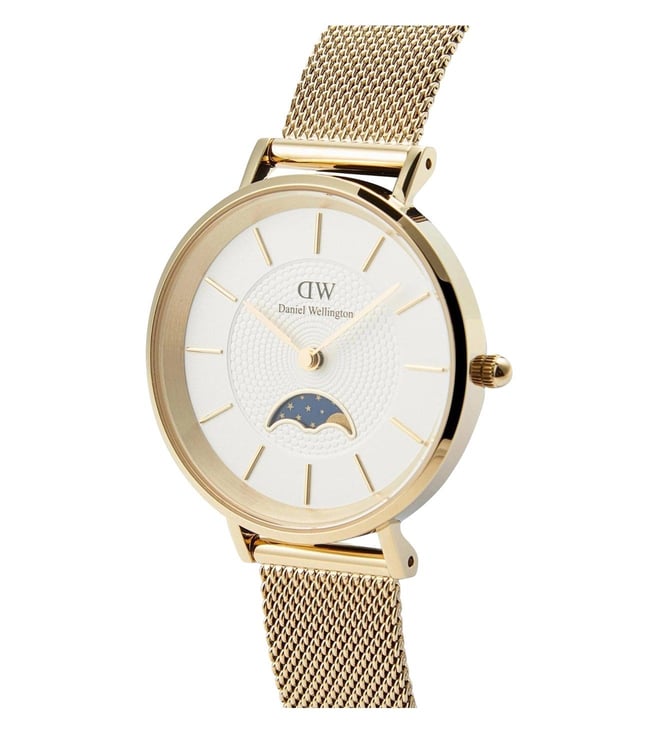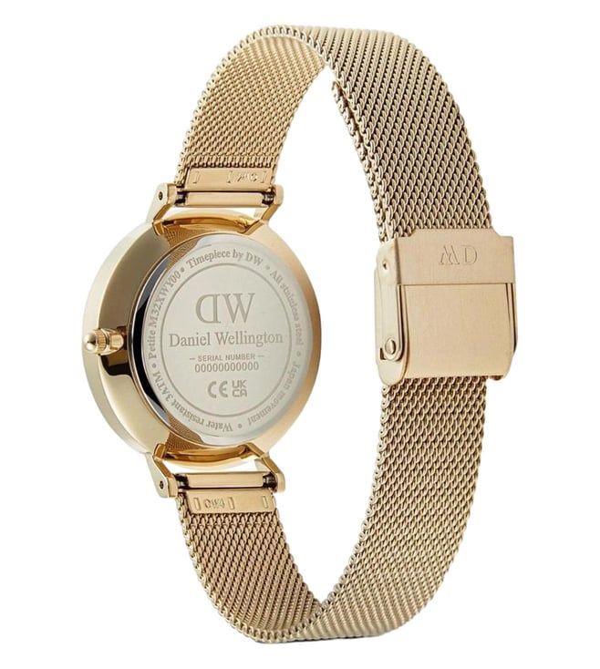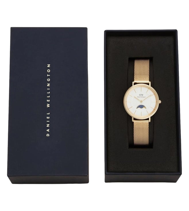 Amaze everyone around you by wearing this Women Analog watch from the collection by Daniel Wellington Encased in a 32 mm case, the White Round dial is protected by a Mineral Glass It features Plain 2-Hand , and a crown for time adjustment. The Stainless Steel strap comes in a Gold Tone hue that further elevates the look of the timekeeper. Besides, it is completed with a Push & Slide Clasp
