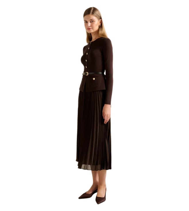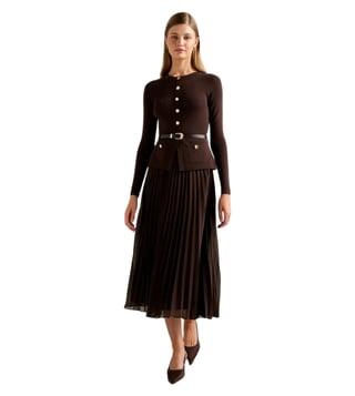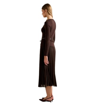 Elevate your style with the Forever New Daphne L/S Midi Dress, a timeless blend of feminine charm and modern detail. Designed with a flattering fit-and-flare silhouette, button-down bodice, pleated midi skirt, and chic front pockets, it offers elegance with utility. Gold-tone buttons and a detachable belt add sophistication, while the fabric, made with at least 50% LENZING ECOVERO viscose from sustainably managed forests, ensures eco-friendly comfort. Perfect for any occasion, this dress is a must-have for the modern woman.