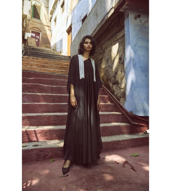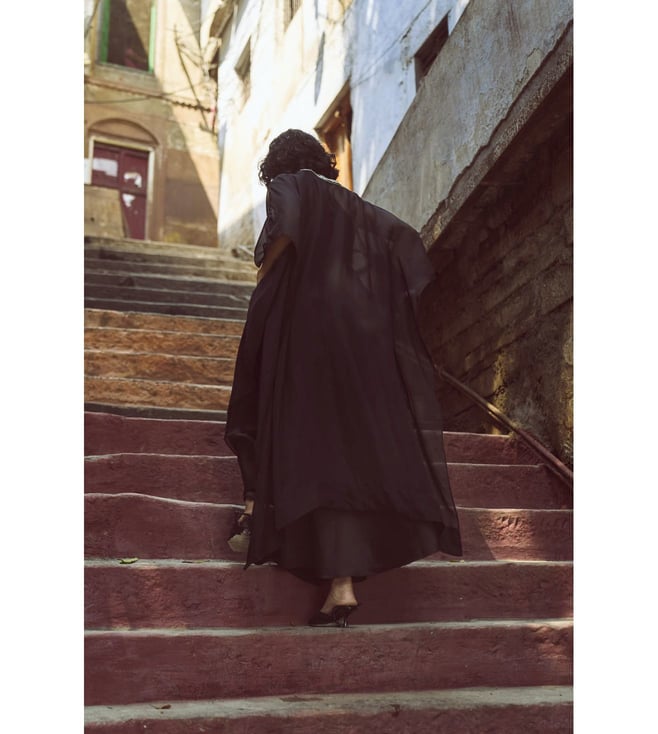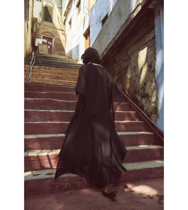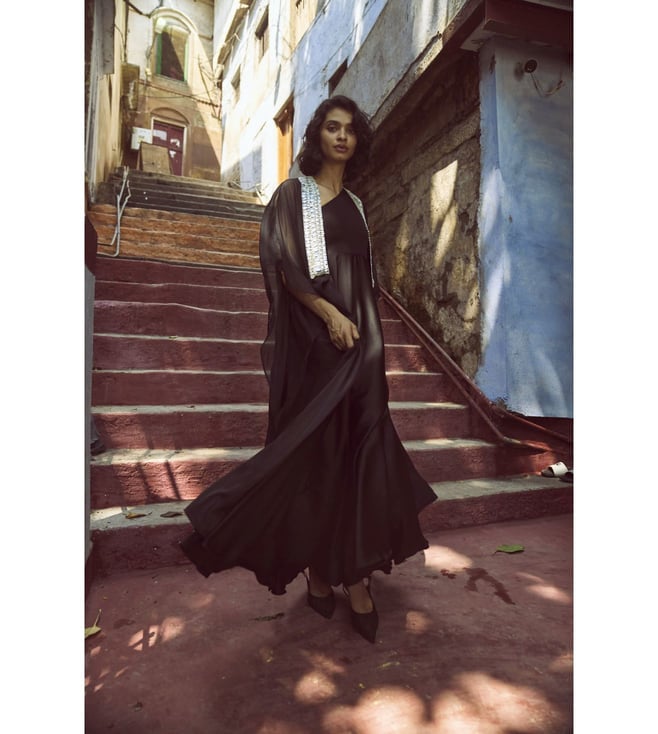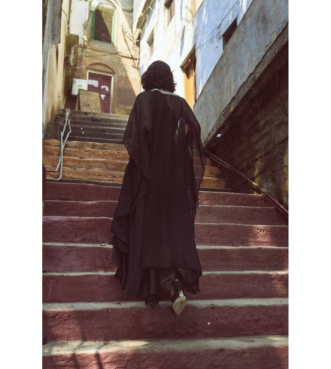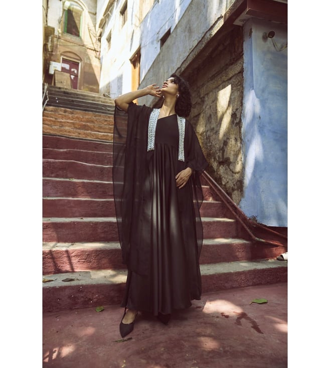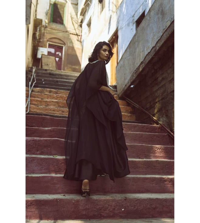 Deck up your wardrobe with this capes. It comes with hand-applied shell, pearl and sequin embroidery around neckline and back collar. It is crafted from 100 percent polyester. Disclaimer: All other items in the image are only for display purposes and will not be a part of the delivery content. Product colour may slightly vary due to photographic lighting sources. Country of Origin - India.