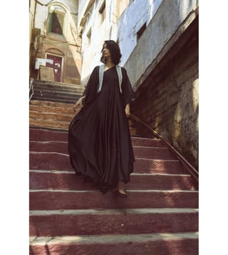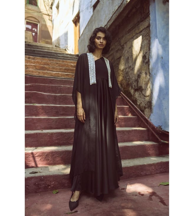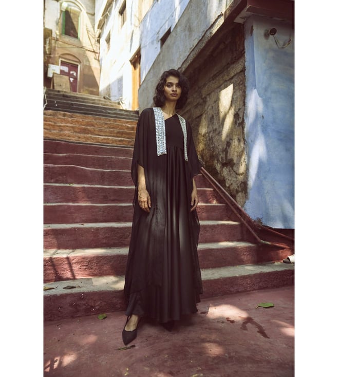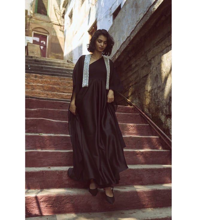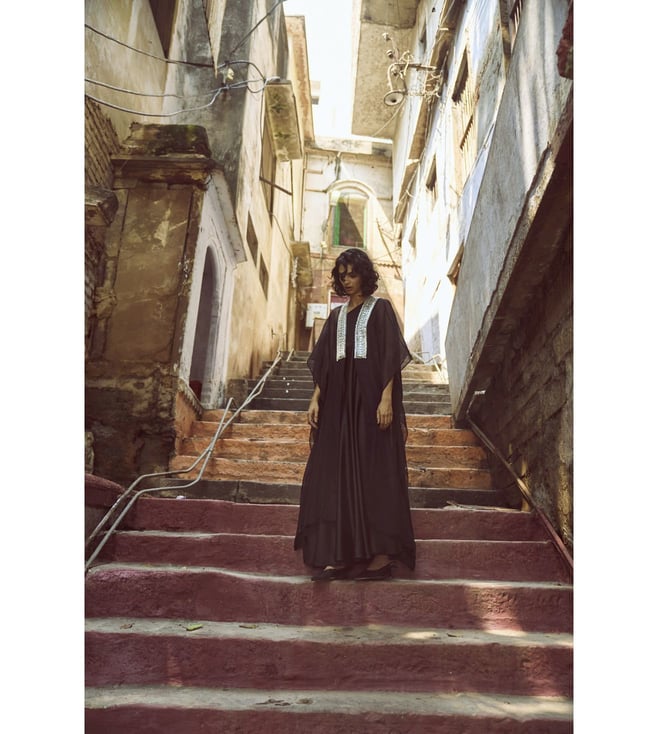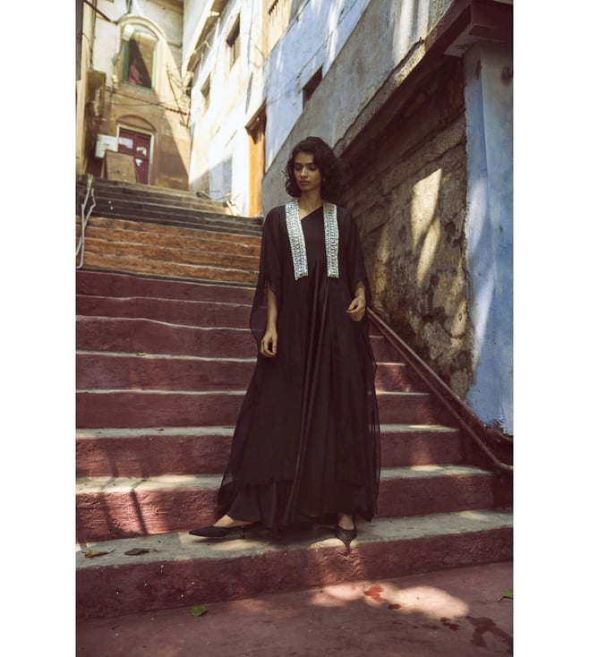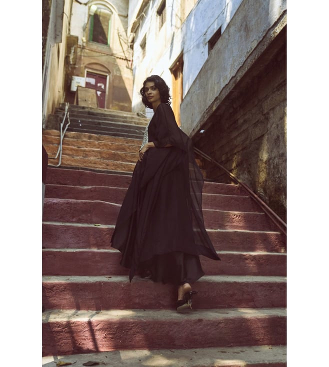 Deck up your wardrobe with this capes. It comes with hand-applied shell, pearl and sequin embroidery around neckline and back collar. It is crafted from 100 percent polyester. Disclaimer: All other items in the image are only for display purposes and will not be a part of the delivery content. Product colour may slightly vary due to photographic lighting sources. Country of Origin - India.