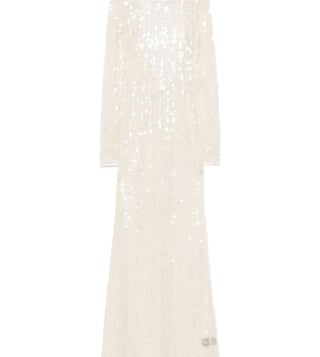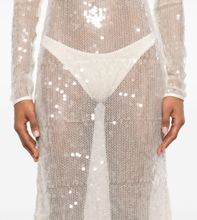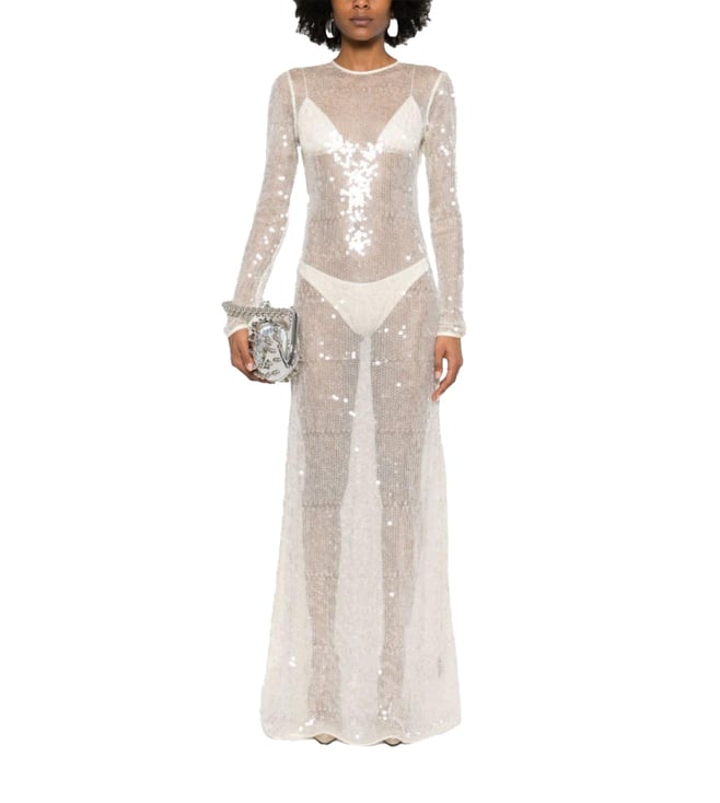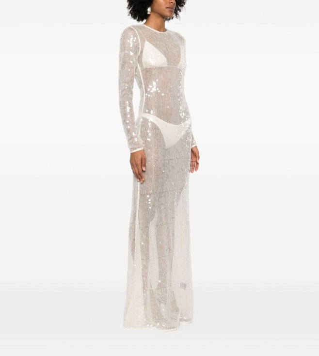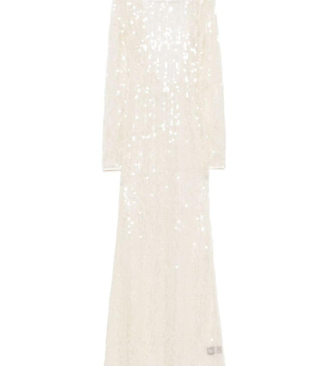 A vision of ethereal elegance, this white dress captivates with its intricate embellished pattern, shimmering like stardust across the fabric. Crafted from a luxurious blend of 89% polyester, 7% nylon, and 4% nacre, it offers a soft yet structured silhouette. The long sleeves gracefully extend to the wrists, while the round neck adds a touch of classic sophistication. Designed for the modern woman, this dress features a seamless closure, ensuring a flawless fit that exudes timeless charm and contemporary allure.