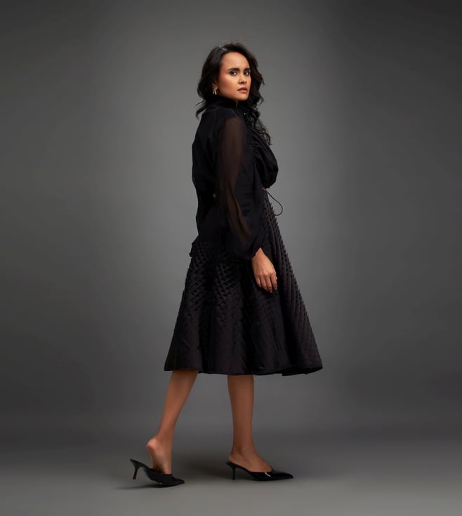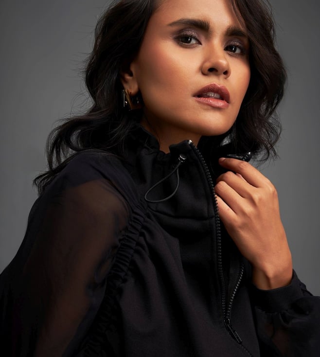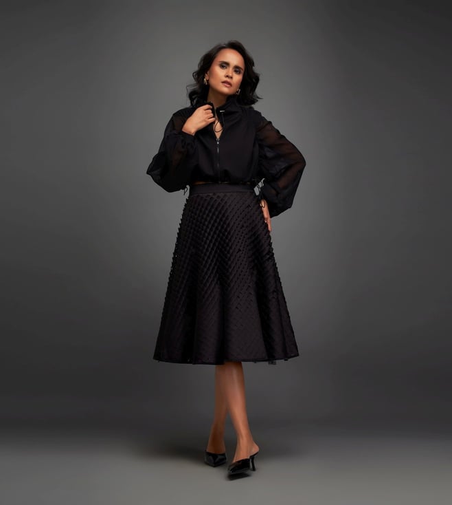 Look impeccably perfect by donning this jacket with skirt. Tailored to sartorial perfection from organza, ponte roma and vegan leather, it assures a soft and soothing touch against the skin. Disclaimer: Product colour may slightly vary due to photographic lighting sources. Country of Origin - India.