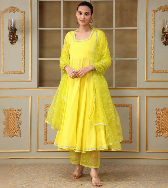 Saadgi Yellow Mirror Work Anarkali Set Anarkali Kurta With Pant And Dupatta